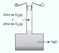 82. Em 1805, o químico francês Gay-Lussac realizou várias experiências com reações químicas envolvendo gases. Em uma dessas experiências, fez reagir os gases hidrogênio e oxigênio nas mesmas condições de pressão e temperatura. Para isso, ele colocava volumes conhecidos desses gases em um tubo de ensaio que ficava emborcado em mercúrio. A mistura gasosa ficava, então, presa entre a superfície do mercúrio e a parte fechada do tubo de ensaio, como se vê na figura: